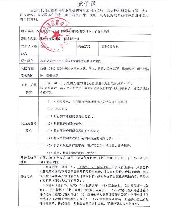 石棉縣醫(yī)療衛(wèi)生機(jī)構(gòu)災(zāi)后加固改造項目冰火板材料采購(第二次)競價公告