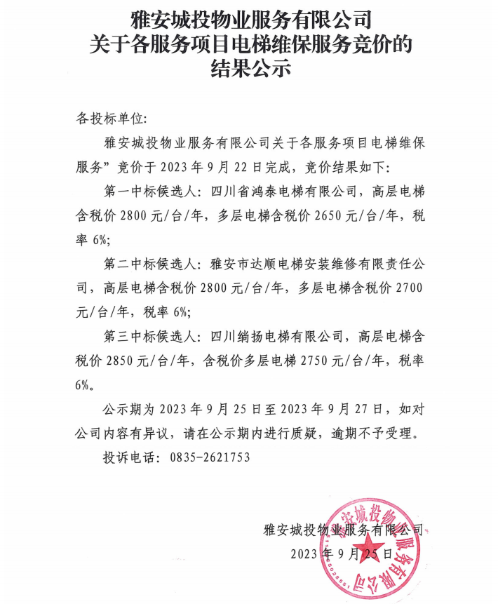 雅安城投物業(yè)服務(wù)有限公司關(guān)于各服務(wù)項(xiàng)目電梯維保服務(wù)競價(jià)的結(jié)果公示
