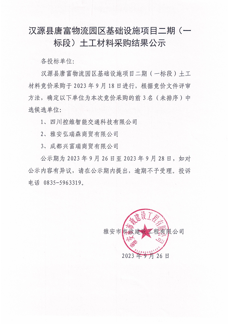 漢源縣唐富物流園區(qū)基礎(chǔ)設(shè)施項(xiàng)目二期(一標(biāo)段)土工材料采購(gòu)結(jié)果公示