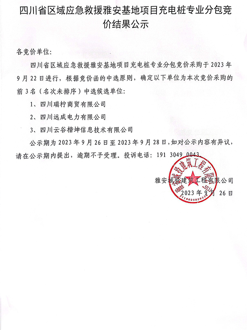 四川省區(qū)域應急救援雅安基地項目充電樁專業(yè)分包競價結果公示