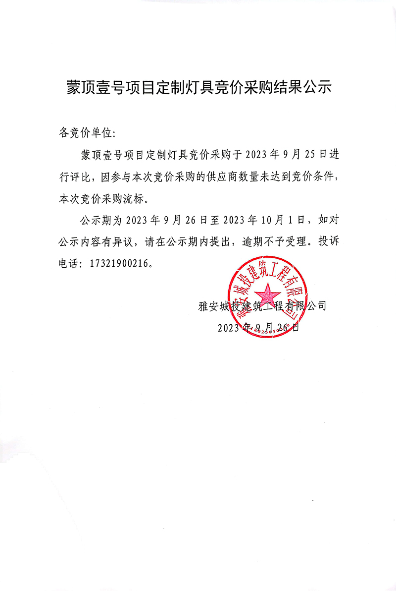 蒙頂壹號項目定制燈具競價采購結果公示
