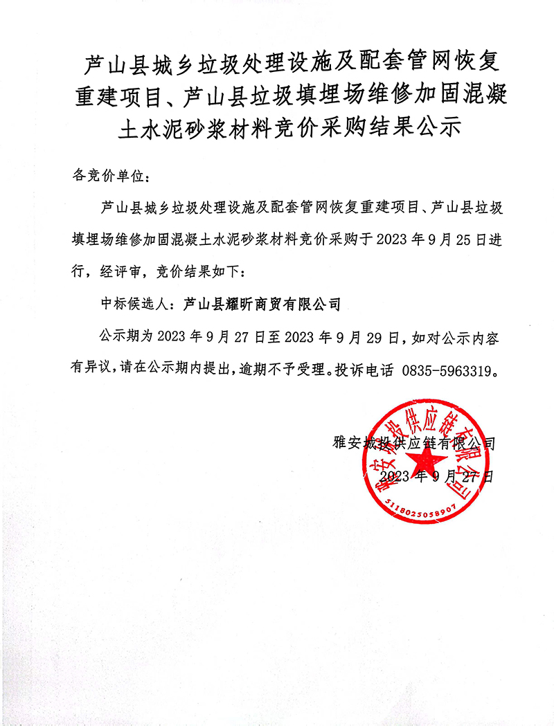 蘆山縣城鄉(xiāng)垃圾處理設施及配套管網(wǎng)恢復重建項目、蘆山縣垃圾填埋場維修加固混凝土水泥砂漿材料競價采購結(jié)果公示