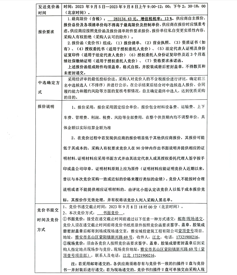 蒙頂壹號項目潛污泵、潛水泵及相關(guān)配件采購(第二次)競價公告