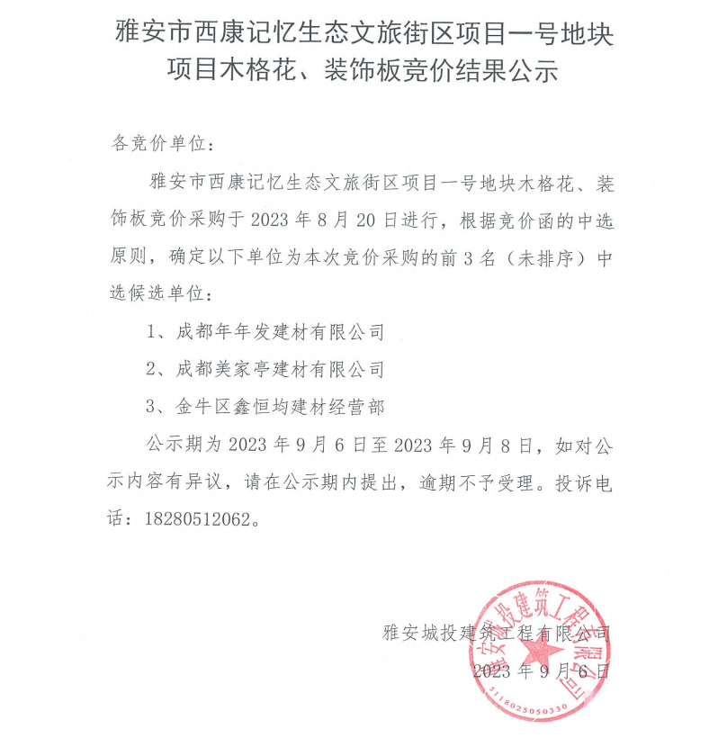 雅安市西康記憶生態(tài)文旅街區(qū)項(xiàng)目一號地塊項(xiàng)目木格花、裝飾板競價結(jié)果公示
