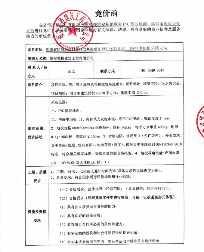 四川省區(qū)域應急救援雅安基地項目PVC橡膠地面、防靜電地板采購安裝競價公告