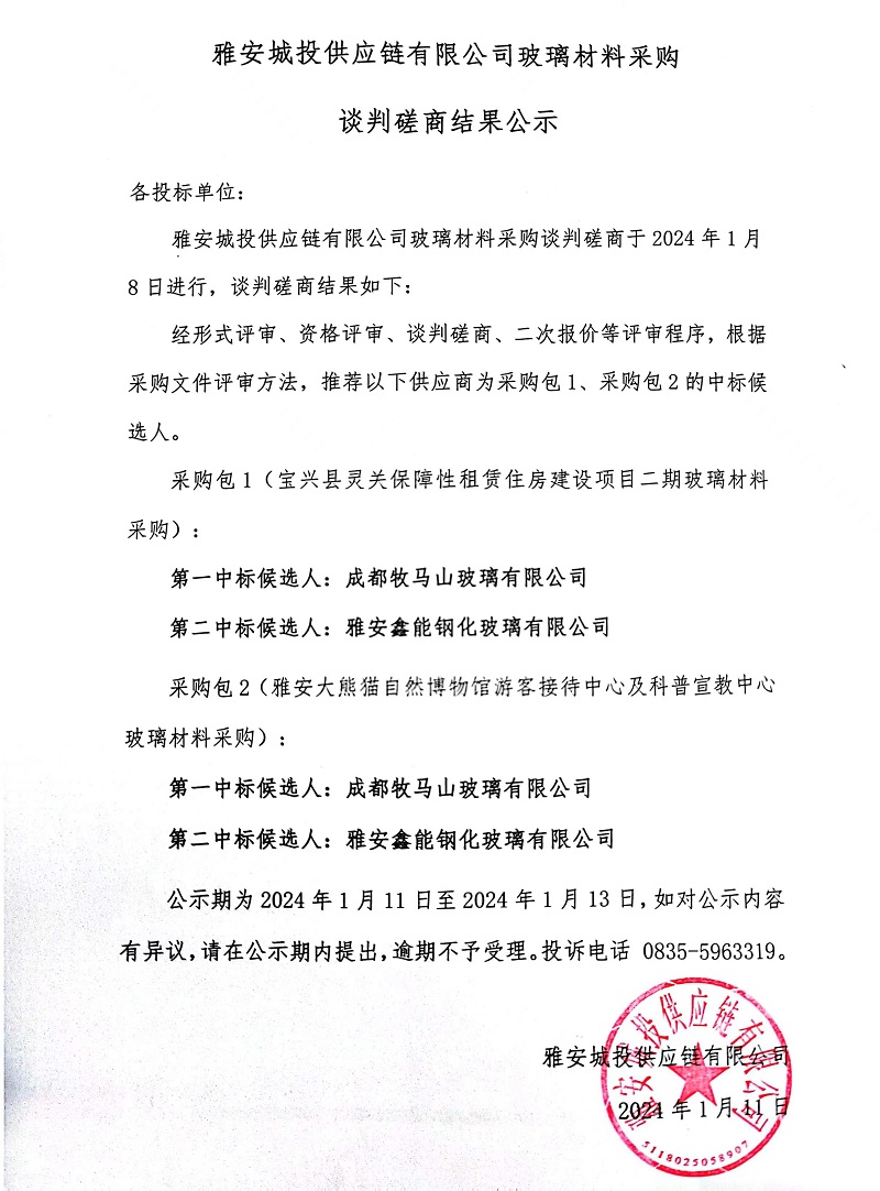 雅安城投供應鏈有限公司玻璃材料采購談判磋商結果公示