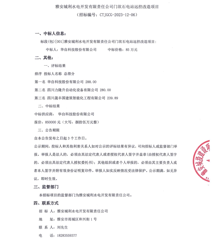 雅安城利水電開(kāi)發(fā)有限責(zé)任公司門(mén)坎石電站遠(yuǎn)控改造項(xiàng)目結(jié)果公示