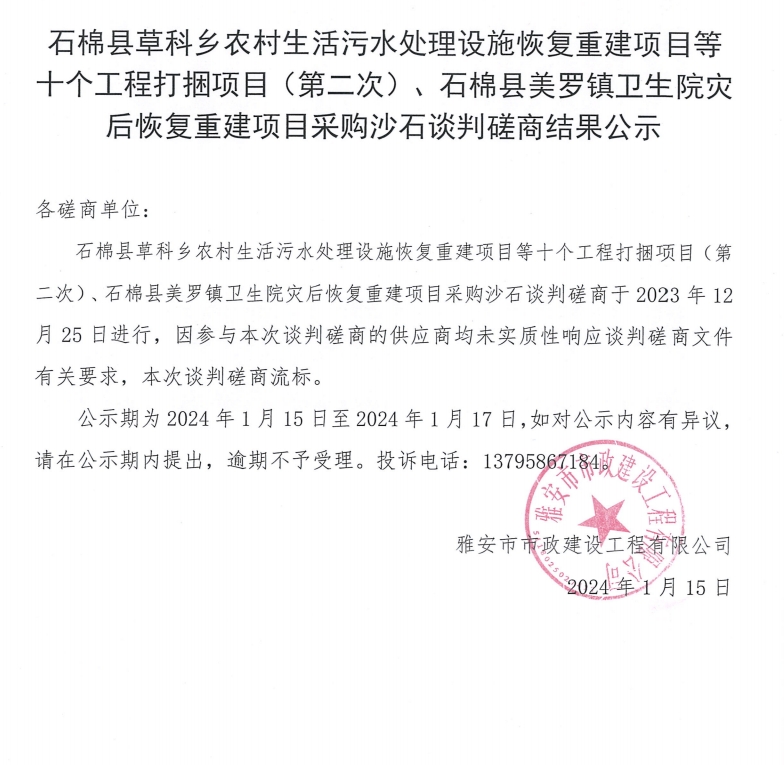 石棉縣草科鄉(xiāng)農(nóng)村生活污水處理設(shè)施恢復(fù)重建項(xiàng)目等十個(gè)工程打捆項(xiàng)目(第二次)、石棉縣美羅鎮(zhèn)衛(wèi)生院災(zāi)后恢復(fù)重建項(xiàng)目采購(gòu)沙石談判磋商結(jié)果公示