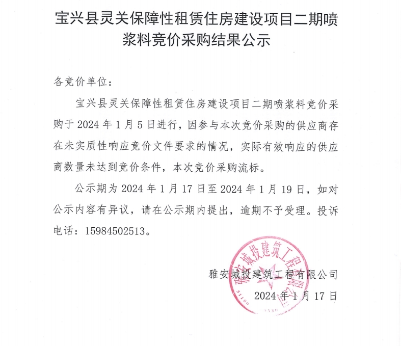 寶興縣靈關(guān)保障性租賃住房建設(shè)項(xiàng)目二期噴漿料競價采購結(jié)果公示
