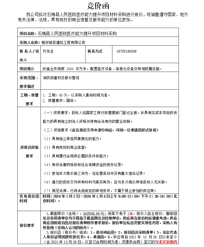 石棉縣人民醫(yī)院醫(yī)療能力提升項目消防材料(二次)采購競價公告
