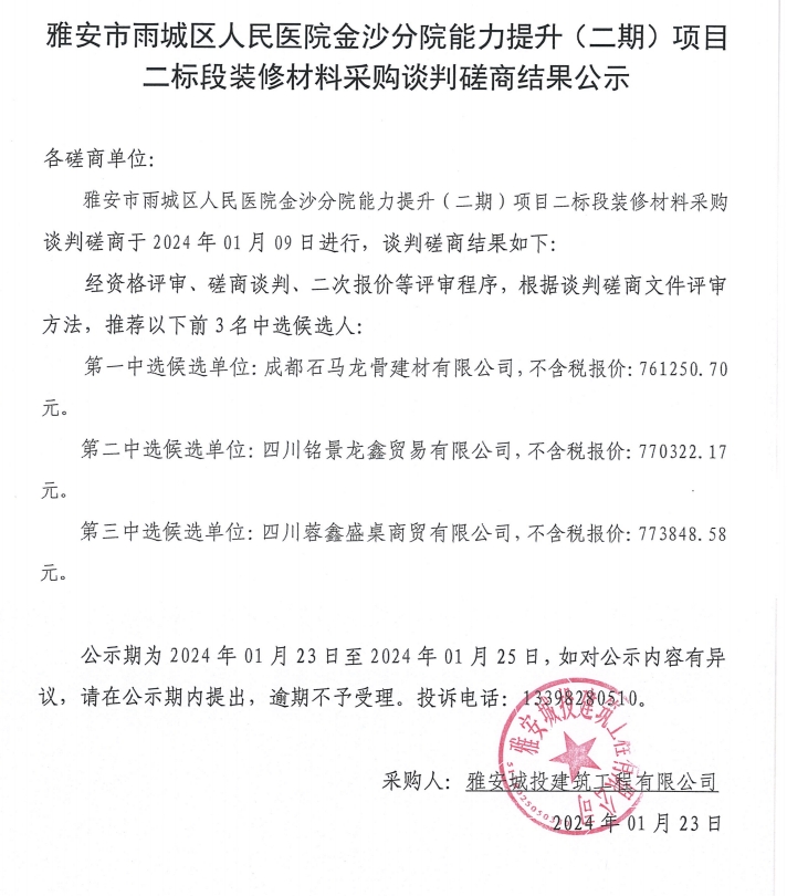雅安市雨城區(qū)人民醫(yī)院金沙分院能力提升(二期)項目二標段裝修材料采購談判磋商結(jié)果公示
