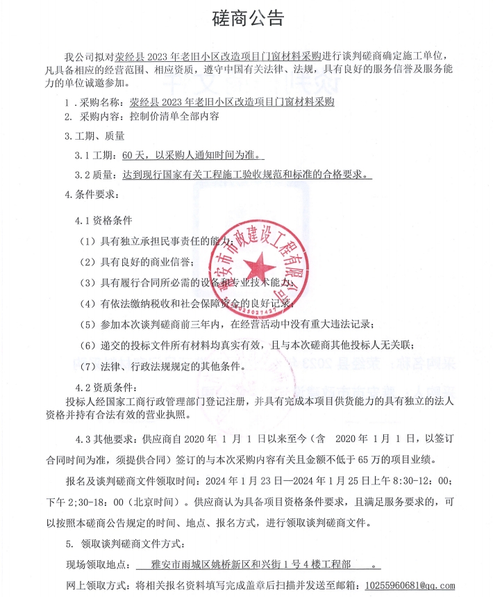滎經(jīng)縣2023年老舊小區(qū)改造項(xiàng)目門窗材料采購(gòu)談判磋商公告
