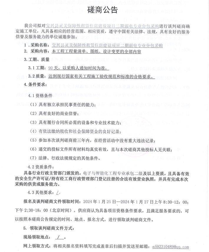 寶興縣靈關(guān)鎮(zhèn)保障性住房建設(shè)項(xiàng)目二期弱電專業(yè)分包采購(gòu)磋商公告