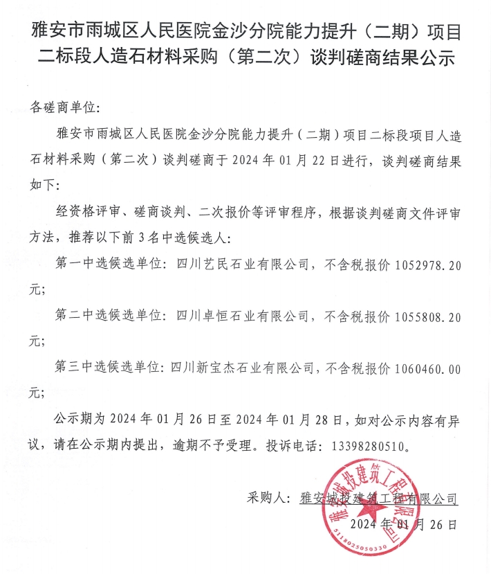 雅安市雨城區(qū)人民醫(yī)院金沙分院能力提升(二期)項目二標段人造石材料采購(第二次)談判磋商結果公示