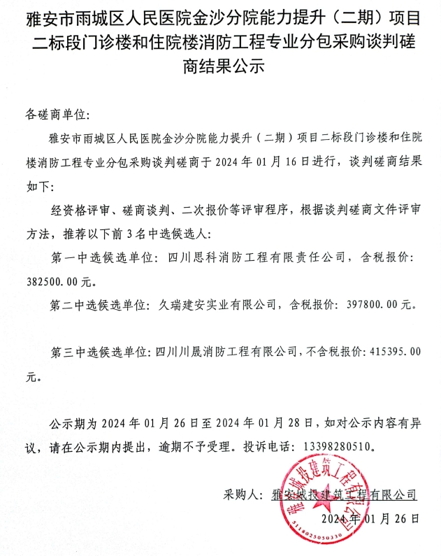 雅安市雨城區(qū)人民醫(yī)院金沙分院能力提升(二期)項(xiàng)目二標(biāo)段門診樓和住院樓消防工程專業(yè)分包采購(gòu)談判磋商結(jié)果公示