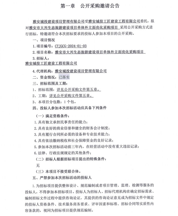 雅安市大興生態(tài)旅游建設(shè)項(xiàng)目單體外立面亮化采購項(xiàng)目公開采購邀請公告