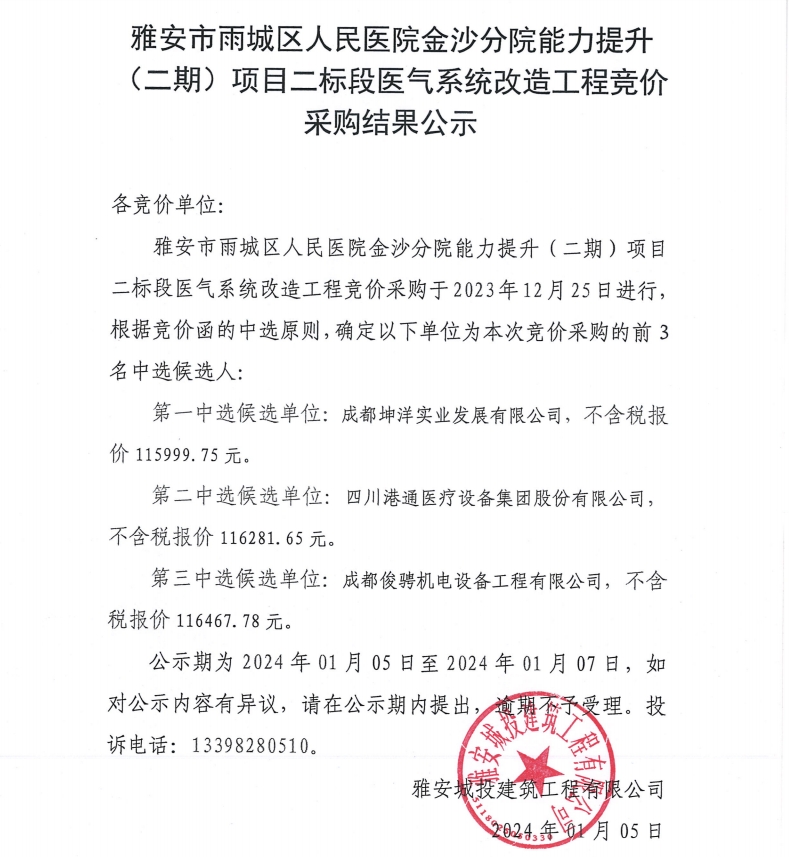 雅安市雨城區(qū)人民醫(yī)院金沙分院能力提升(二期)項(xiàng)目二標(biāo)段醫(yī)氣系統(tǒng)改造工程競(jìng)價(jià)采購(gòu)結(jié)果公示