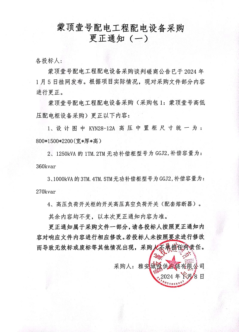 蒙頂壹號(hào)配電工程配電設(shè)備采購(gòu)更正通知(一)