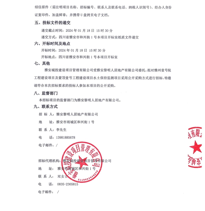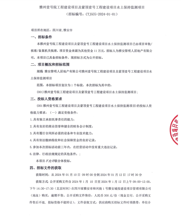 雅州壹號院工程建設(shè)項目及蒙頂壹號工程建設(shè)項目水土保持監(jiān)測項目公告