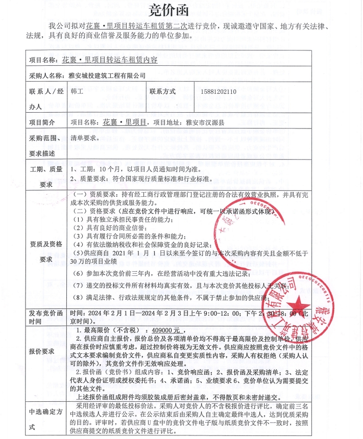 花襄·里項(xiàng)目轉(zhuǎn)運(yùn)車(chē)租賃(第二次)競(jìng)價(jià)公告