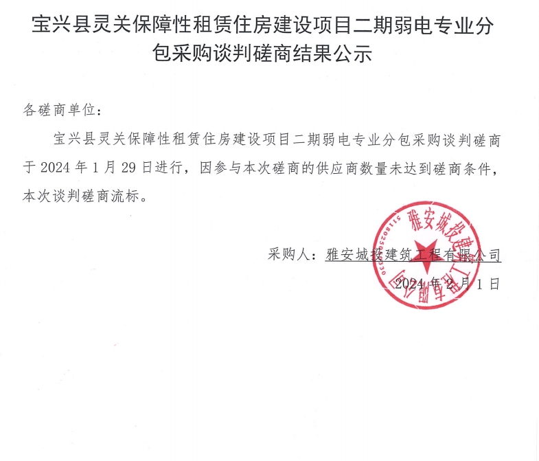 寶興縣靈關(guān)保障性租賃住房建設(shè)項(xiàng)目二期弱電專業(yè)分包采購談判磋商結(jié)果公示