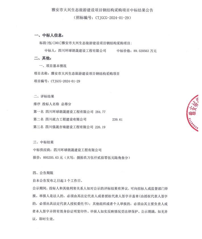 雅安市大興生態(tài)旅游建設項目結構采購項目中標結果公告