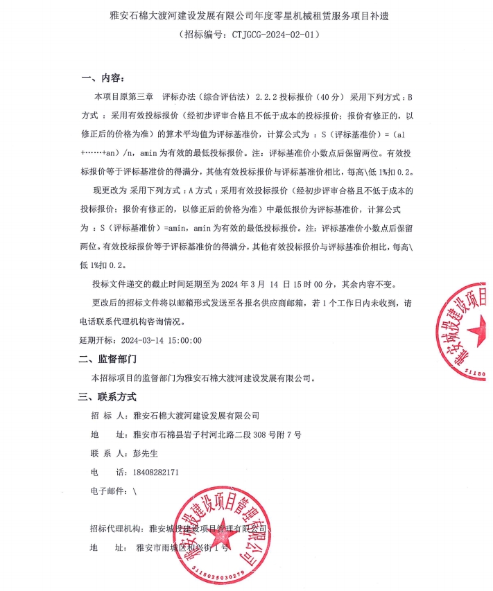 雅安石棉大渡河建設(shè)發(fā)展有限公司年度零星機(jī)械租賃服務(wù)項(xiàng)目補(bǔ)遺公告