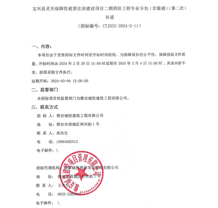 寶興縣靈關(guān)保障性租賃住房建設(shè)項(xiàng)目二期消防工程專業(yè)分包(含暖通)(第二次)補(bǔ)遺公告