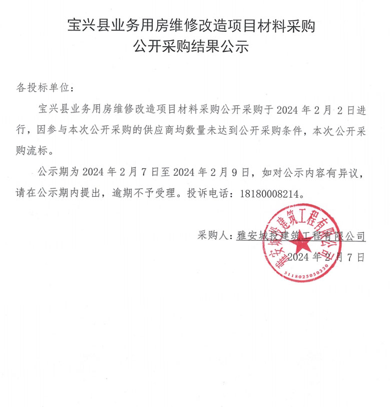 寶興縣業(yè)務(wù)用房維修改造項(xiàng)目材料采購(gòu)公開(kāi)采購(gòu)結(jié)果公示