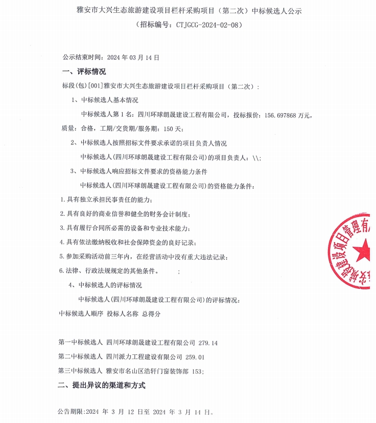 雅安市大興生態(tài)旅游建設(shè)項(xiàng)目欄桿采購項(xiàng)目(第二次)中標(biāo)候選人公示