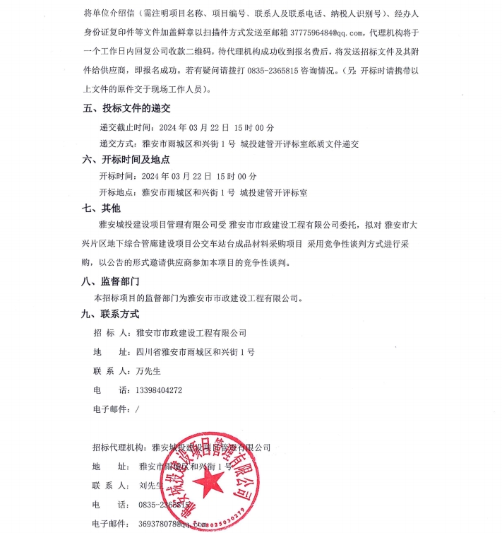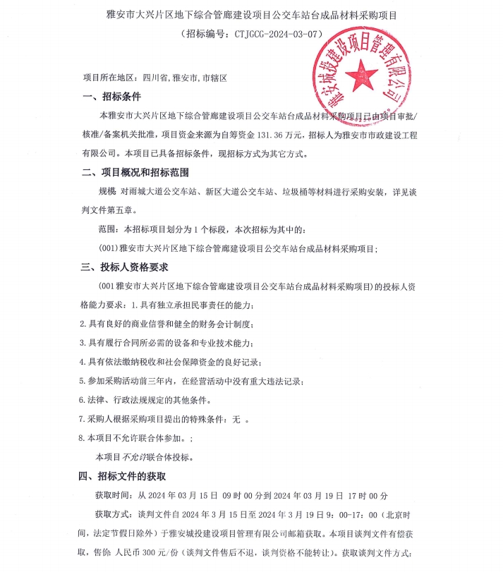 雅安市大興片區(qū)地下綜合管廊建設(shè)項(xiàng)目公交車(chē)站臺(tái)成品材料采購(gòu)項(xiàng)目公告