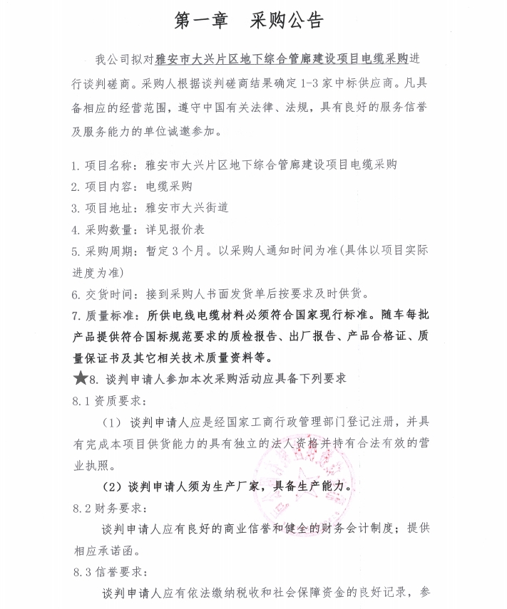 雅安市大興片區(qū)地下綜合管廊建設(shè)項(xiàng)目電纜采購公告