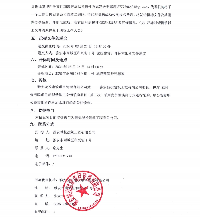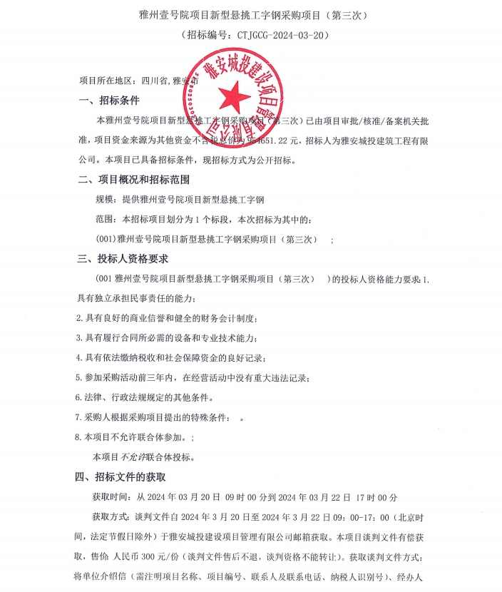 雅州壹號院項(xiàng)目新型懸挑工字鋼采購(第三次)公告