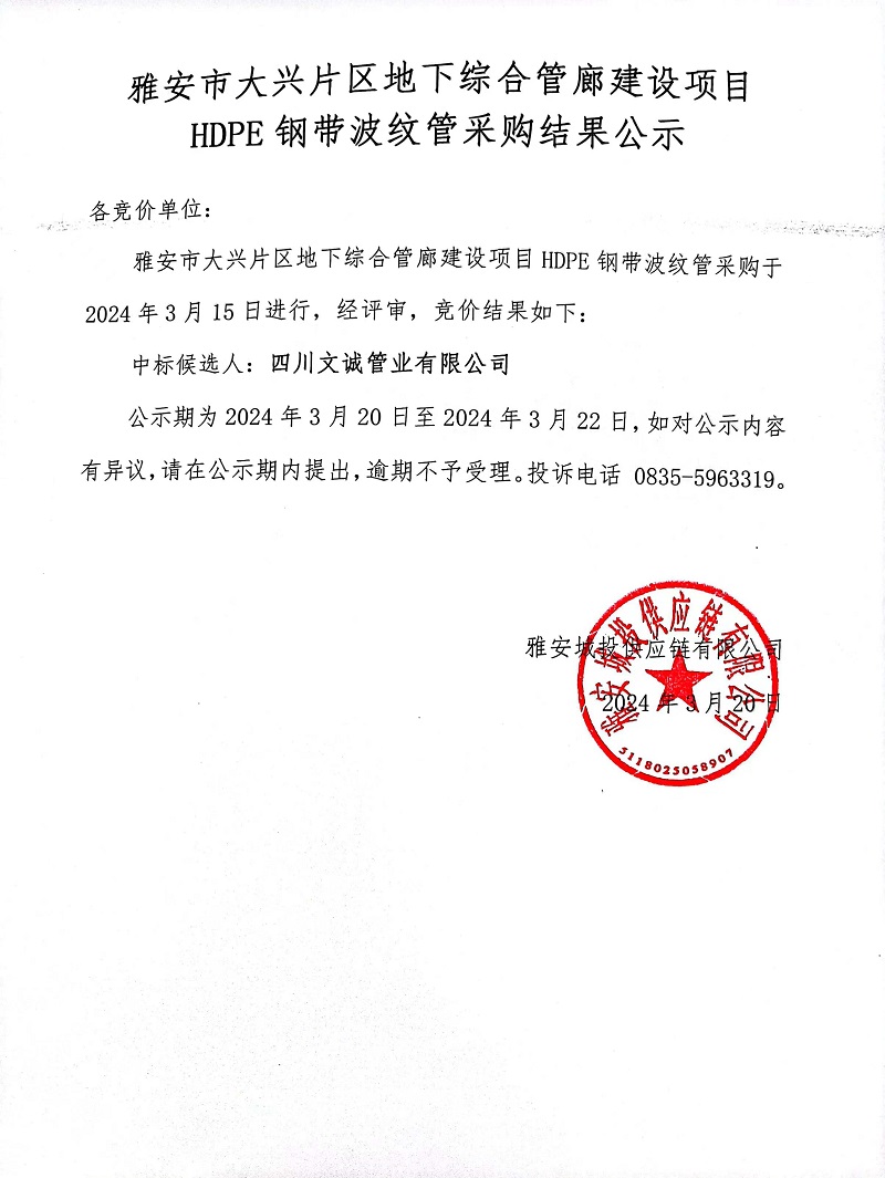 雅安市大興片區(qū)地下綜合管廊建設(shè)項(xiàng)目HDPE鋼帶波紋管采購結(jié)果公示