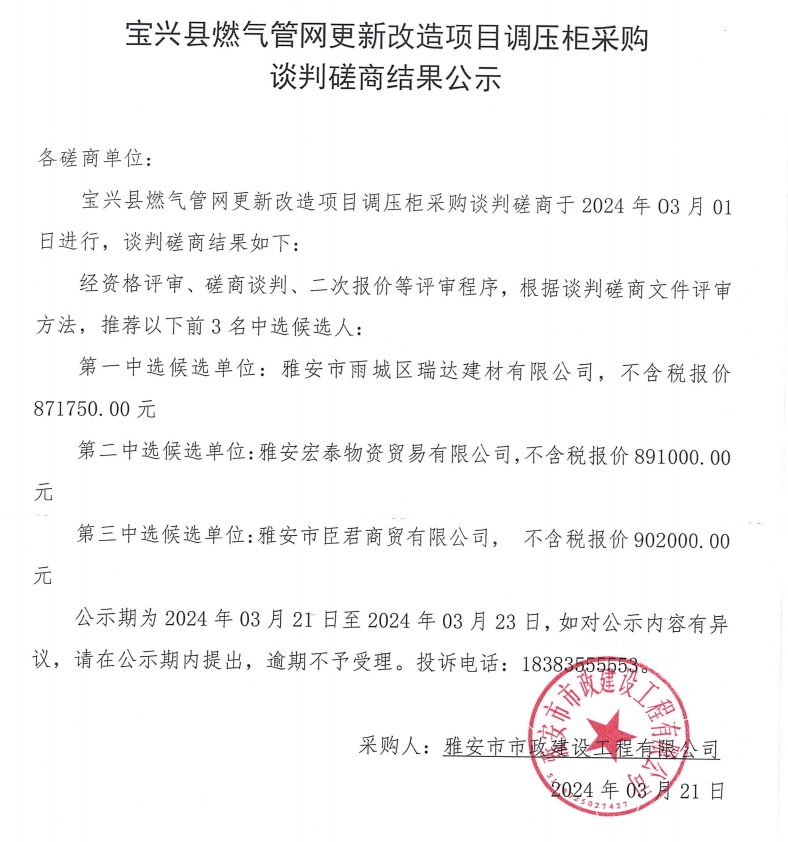 寶興縣燃?xì)夤芫W(wǎng)更新改造項目調(diào)壓柜采購談判磋商結(jié)果公示