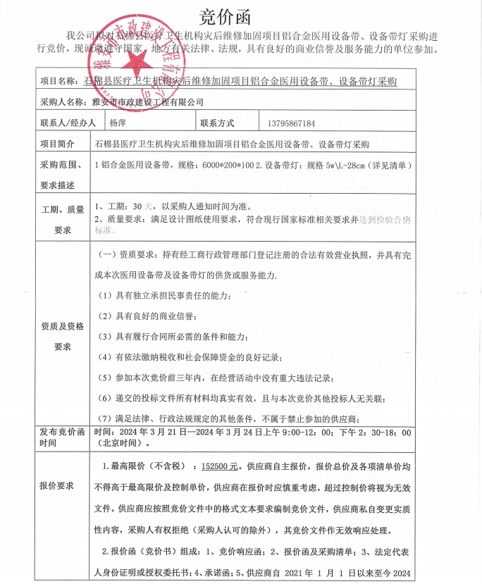 石棉縣醫(yī)療衛(wèi)生機(jī)構(gòu)災(zāi)后維修加固項(xiàng)目鋁合金醫(yī)用設(shè)備帶、設(shè)備帶燈采購競(jìng)價(jià)公告