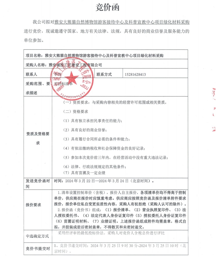 雅安大熊貓自然博物館游客接待中心及科普宣教中心項(xiàng)目綠化材料采購(gòu)競(jìng)價(jià)公告