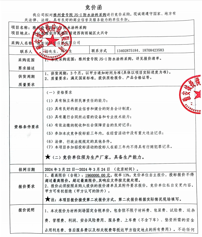 雅州壹號(hào)院JS-I防水涂料采購競價(jià)公告