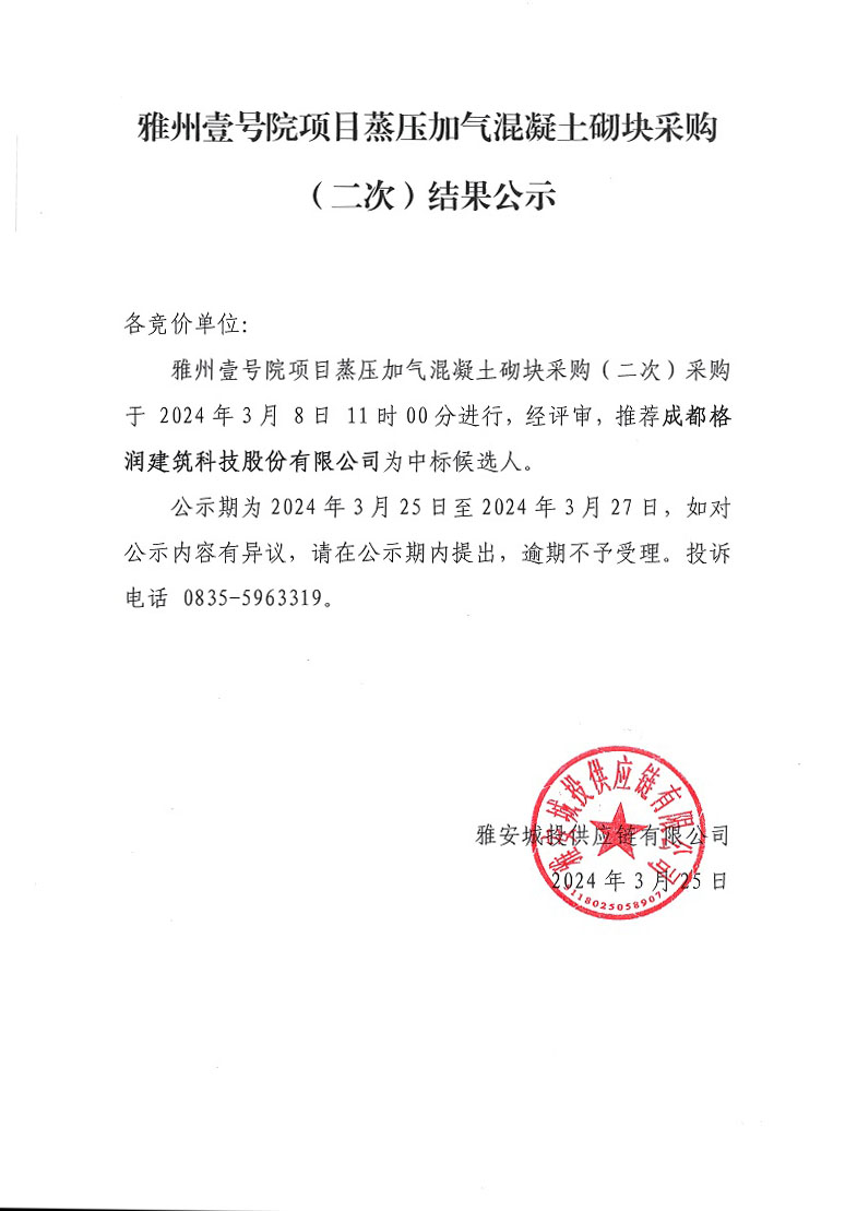 雅州壹號院項目蒸壓加氣混凝土砌塊采購(第二次)結(jié)果公示