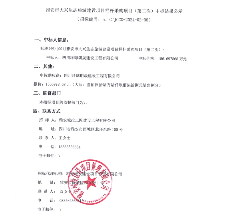 雅安市大興生態(tài)旅游建設項目欄桿采購項目(第二次)中標結果公示