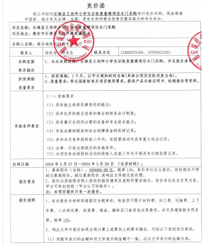 附件1:報(bào)價(jià)清單--石棉縣王崗坪小學(xué)災(zāi)后恢復(fù)重建項(xiàng)目木門采購(gòu)