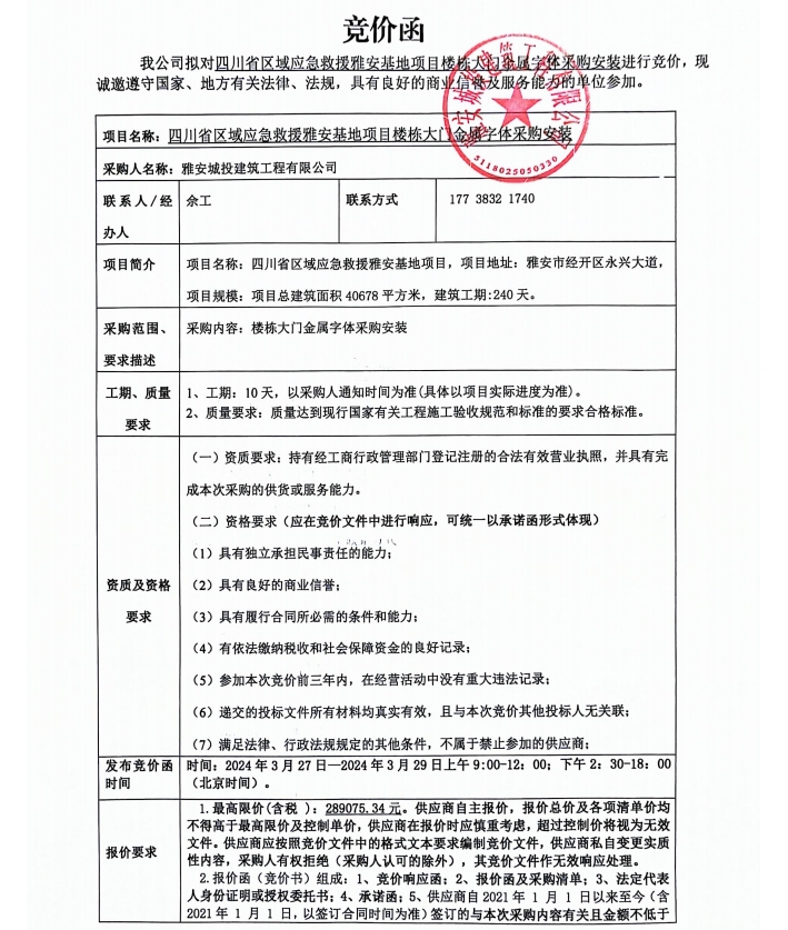 四川省區(qū)域應(yīng)急救援雅安基地項目樓棟大門金屬字體采購安裝競價公告
