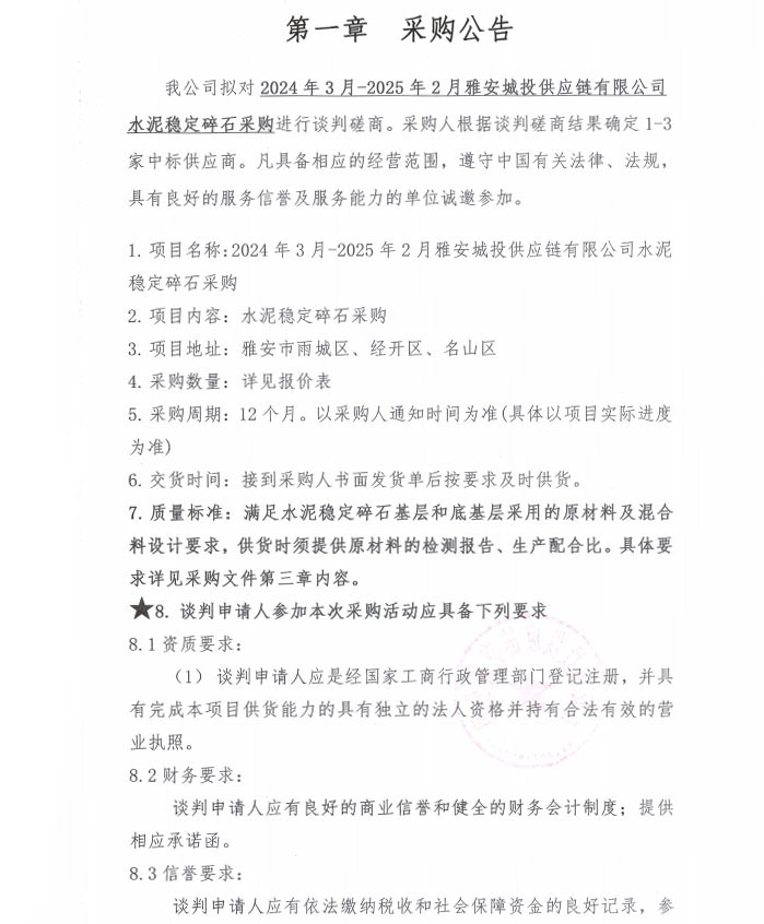 2024年3月-2025年2月雅安城投供應鏈有限公司水泥穩(wěn)定碎石采購公告