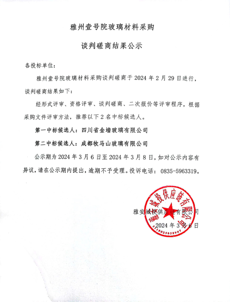 雅州壹號院玻璃材料采購談判磋商結果公示