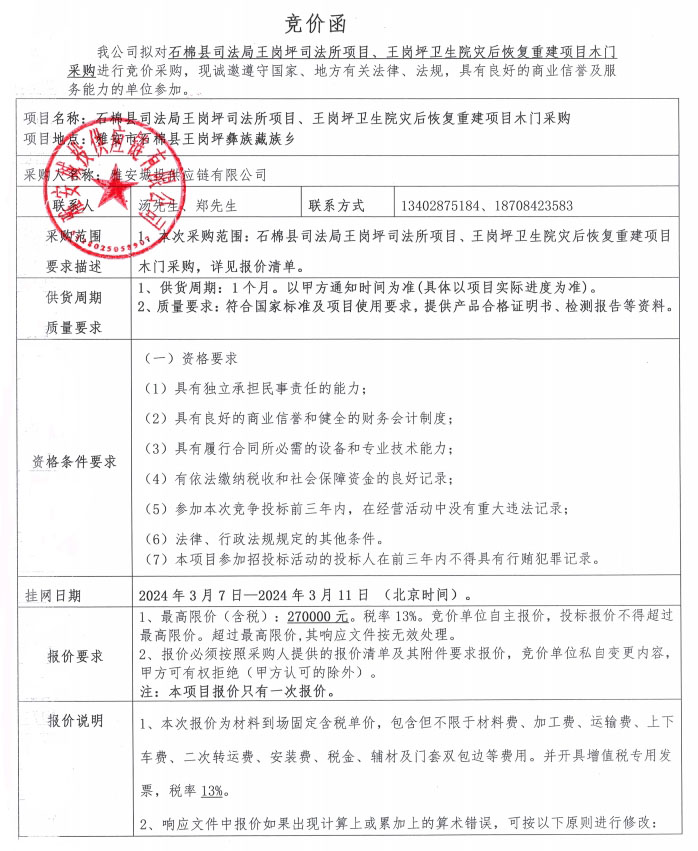附件1:競價函-石棉縣司法局王崗坪司法所項目、王崗坪衛(wèi)生院災后恢復重建項目木門材料采購