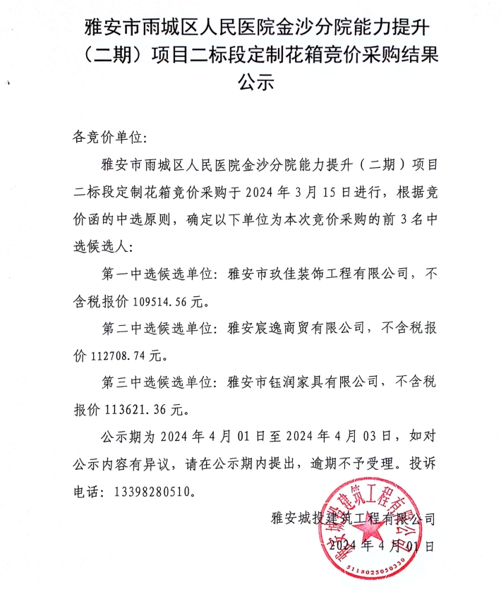 雅安市雨城區(qū)人民醫(yī)院金沙分院能力提升(二期)項(xiàng)目二標(biāo)段定制花箱競(jìng)價(jià)采購(gòu)結(jié)果公示