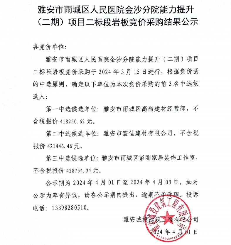 雅安市雨城區(qū)人民醫(yī)院金沙分院能力提升(二期)項(xiàng)目二標(biāo)段巖板競(jìng)價(jià)采購(gòu)結(jié)果公示