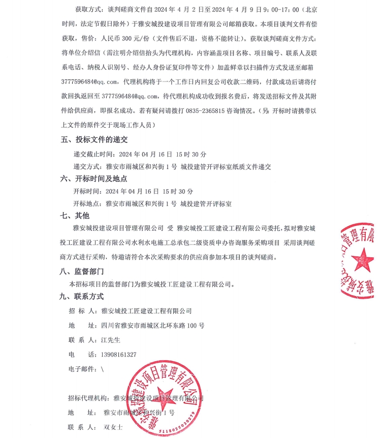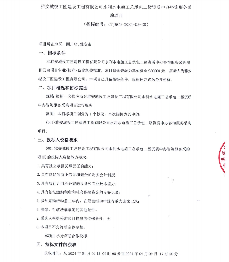 雅安城投工匠建設(shè)工程有限公司水利水電施工總承包二級資質(zhì)申辦咨詢服務(wù)采購項(xiàng)目公告