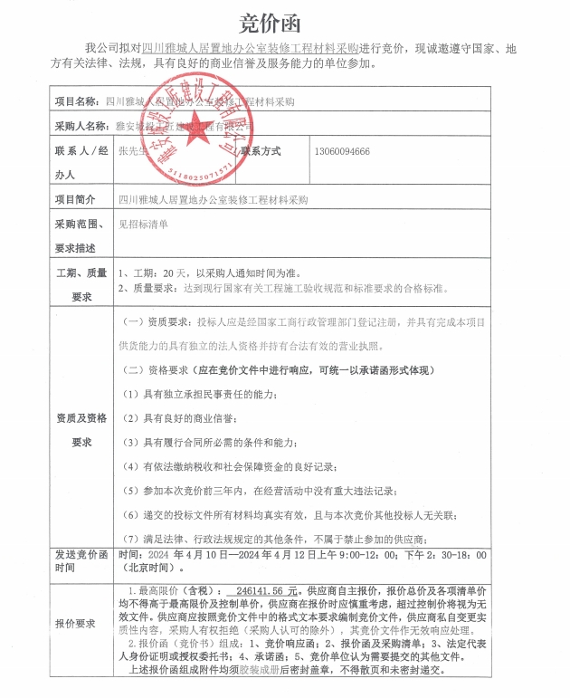 四川雅城人居置地辦公室裝修工程材料采購競(jìng)價(jià)公告