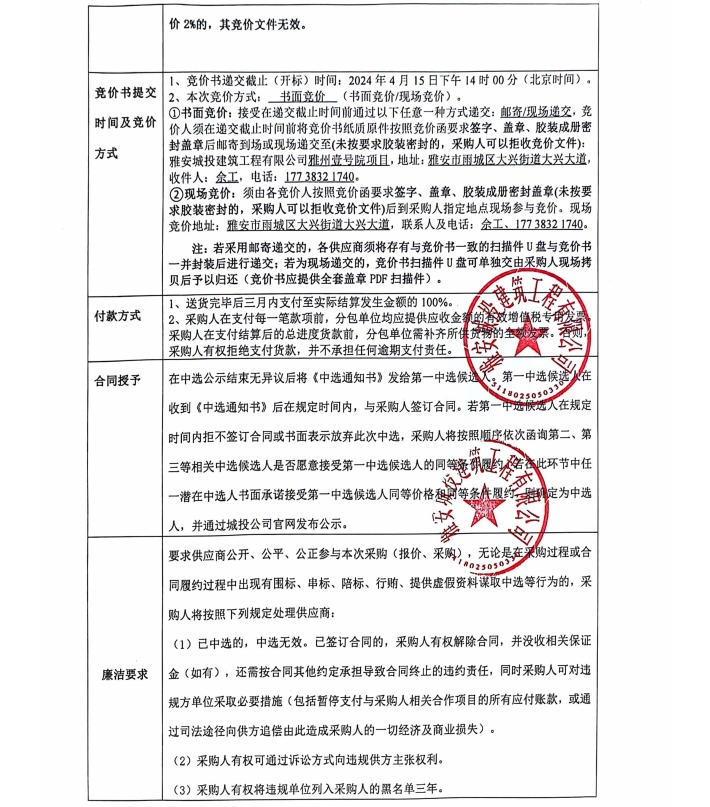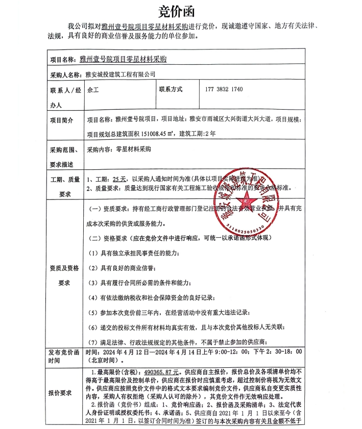 雅州壹號院項(xiàng)目零星材料采購競價(jià)公告